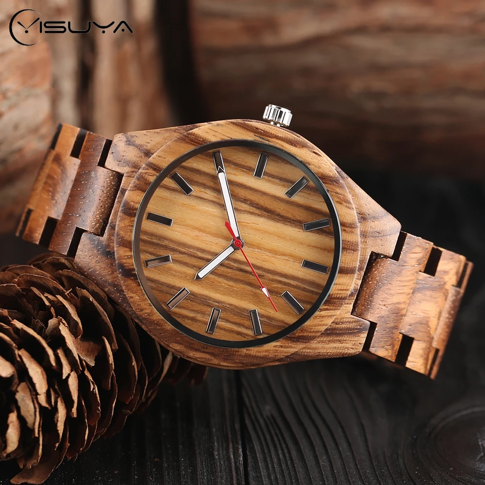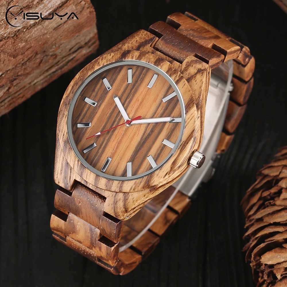 Full Stripe Bamboo Wooden Men Wrist Watch Nature Wood Band Fold Clasp Quartz Males Watches Handmade